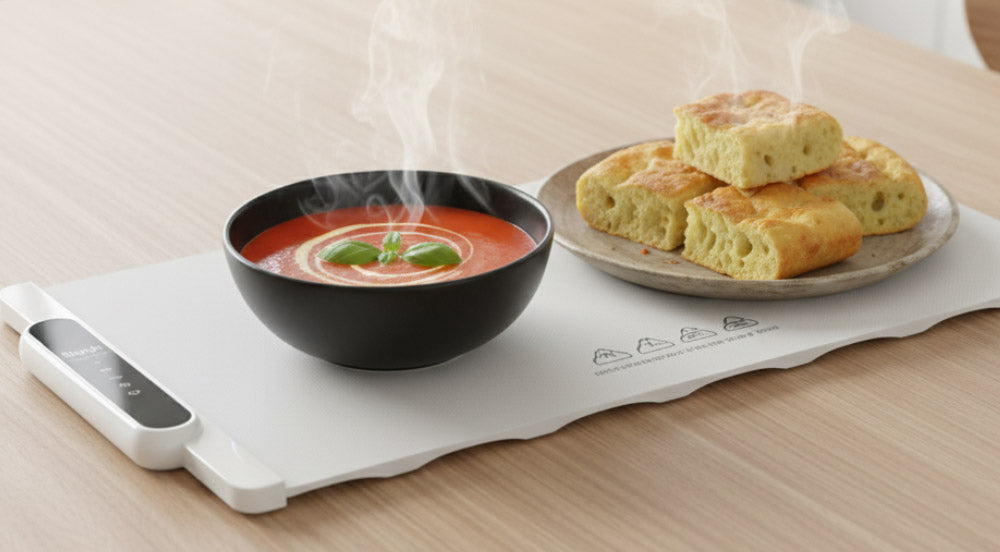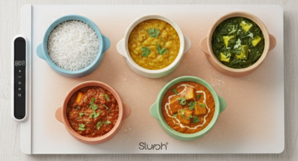 Standard warming trays are rigid, difficult to clean, and not portable.Slursh offers a compact, rollable silicone warming tray that easily stores and travels with you, keeping your meals warm and fresh wherever you go.