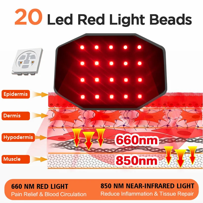 InfraHeat combines 18W power, 3 vibration modes, 3 hot compress levels, and 3 infrared therapy levels in one lightweight (161g) device that works on 5 body areas.